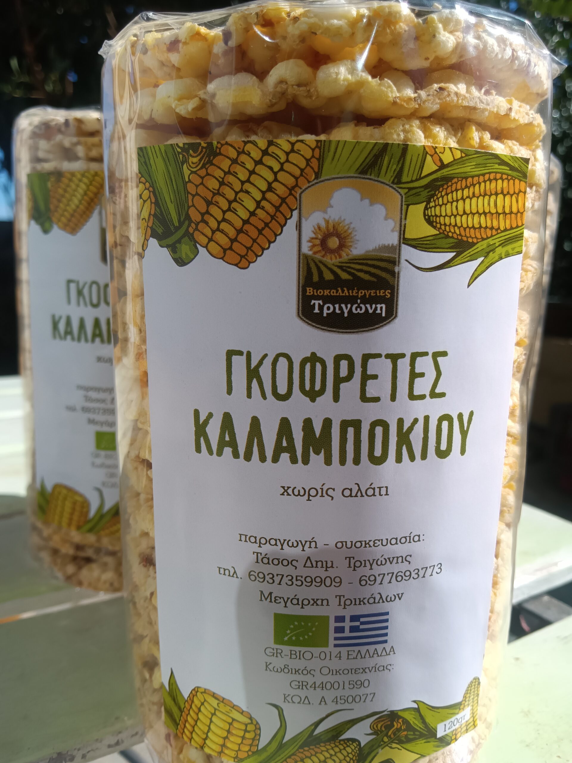 Οι γκοφρέτες καλαμποκιόυ χωρίς αλάτι παράγονται και συσκευάζονται απο τον Τάσο τον Τριγώνη στο Μεγάρχη Τρικάλων είναι πιστοποιήμένο βιολογικό προϊον.Είναι ένα υγιεινό σνακ φτιαγμένο με καλαμπόκι παραγωγής του, αποτελούν εξαιρετική επιλογή για vegan διατροφή και όσους αποφεύγουν τη γλουτένη Έχουν χαμηλά λιπαρά,& θερμίδες αποτελούν πηγή φυτικών ινών και ψευδαργύρου και διαθέτουν υψηλή περιεκτικότητα σε φώσφορο, μαγνήσιο και μαγγάνιο(περίπου 30 kcal ανά τεμάχιο), πλούσιες σε φυτικές ίνες και ιδανικές για εύκολα αλμυρά και γλυκά σνακ
