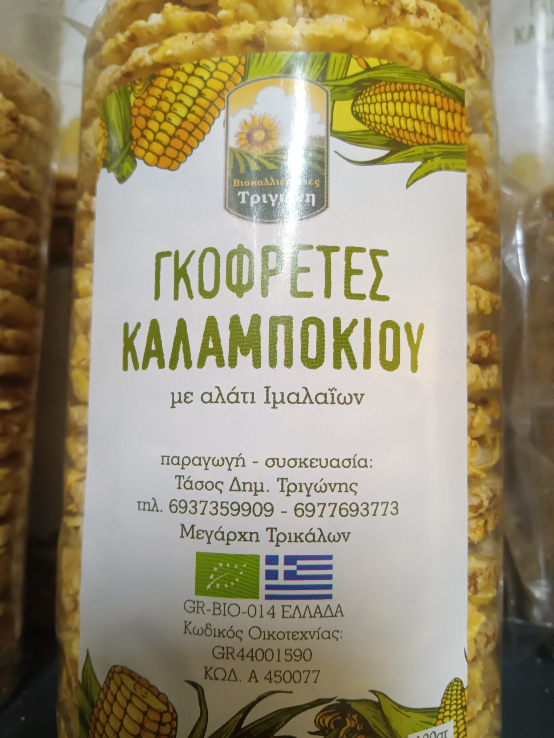 Οι γκοφρέτες καλαμποκιου με αλάτι Ιμαλαϊων παράγονται και συσκευάζονται απο τον Τάσο τον Τριγώνη στο Μεγάρχη Τρικάλων είναι πιστοποιήμένο βιολογικό προϊον.Είναι ένα υγιεινό σνακ φτιαγμένο με καλαμπόκι παραγωγής του, αποτελούν εξαιρετική επιλογή για vegan διατροφή και όσους αποφεύγουν τη γλουτένη Έχουν χαμηλά λιπαρά,& θερμίδες αποτελούν πηγή φυτικών ινών και ψευδαργύρου και διαθέτουν υψηλή περιεκτικότητα σε φώσφορο, μαγνήσιο και μαγγάνιο(περίπου 30 kcal ανά τεμάχιο), πλούσιες σε φυτικές ίνες και ιδανικές για εύκολα αλμυρά και γλυκά σνακ